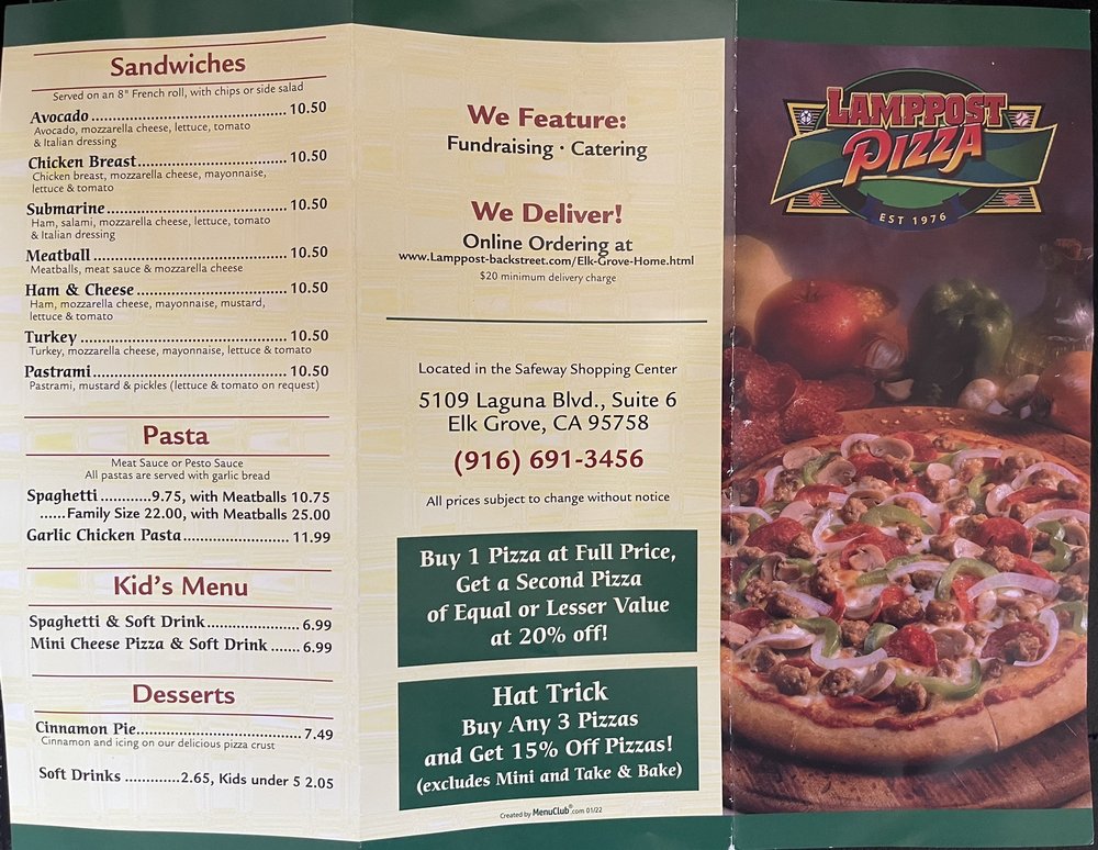 Lamppost Pizza in Elk Grove, CA is a casual yet classy spot offering delicious pizza and more. With options for delivery, takeout, reservations, and catering, they cater to all needs. Customers rave about the flavorful pizzas, with gluten-free crust and various toppings available. The ambiance is welcoming, perfect for gatherings or a cozy meal. The cheese, crust, and sauce are all praised for their quality, making each bite satisfying. The restaurant also offers a pizza buffet with salad and breadsticks, perfect for a hearty meal. Whether you're a regular or a first-timer, Lamppost Pizza promises a satisfying dining experience filled with great food and friendly service.